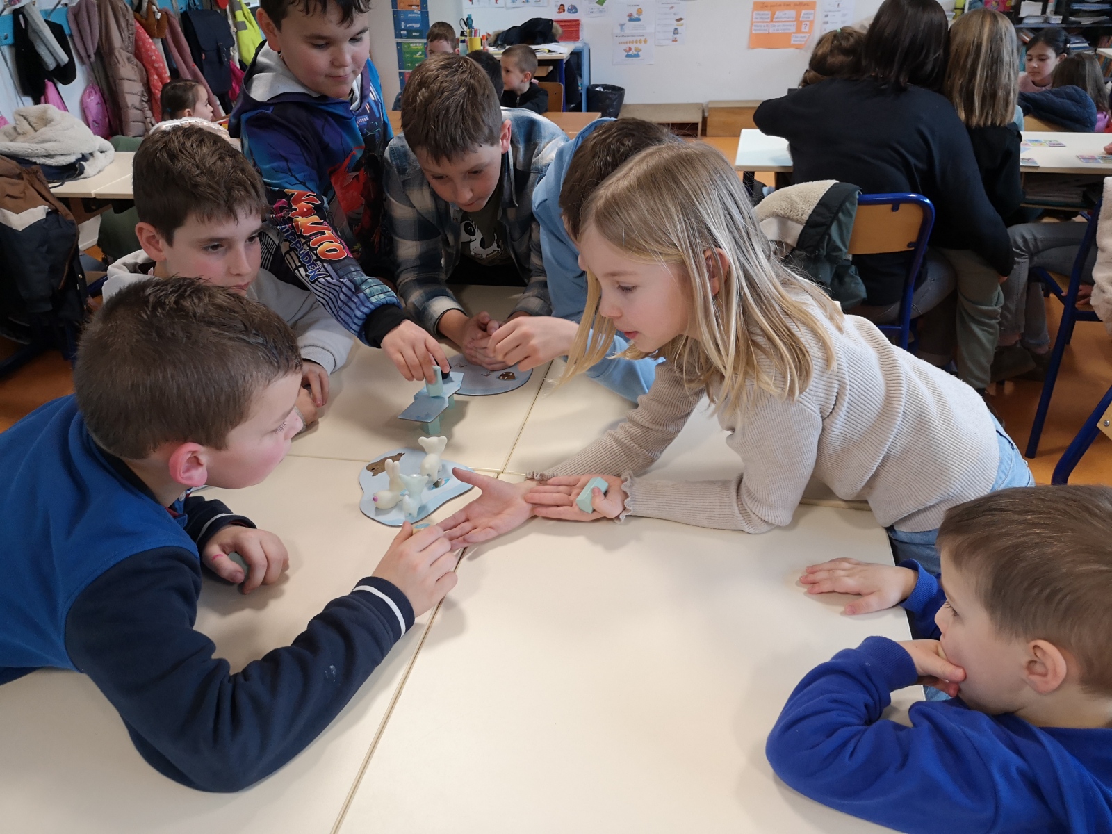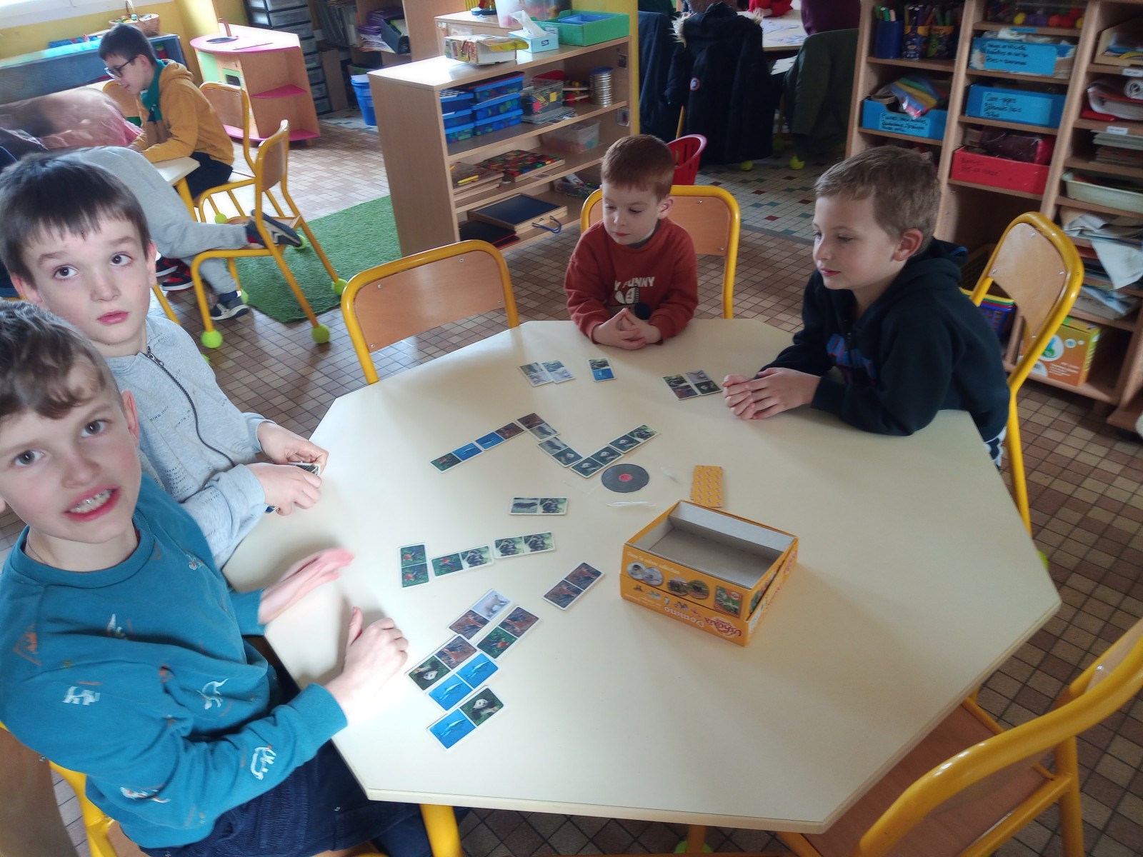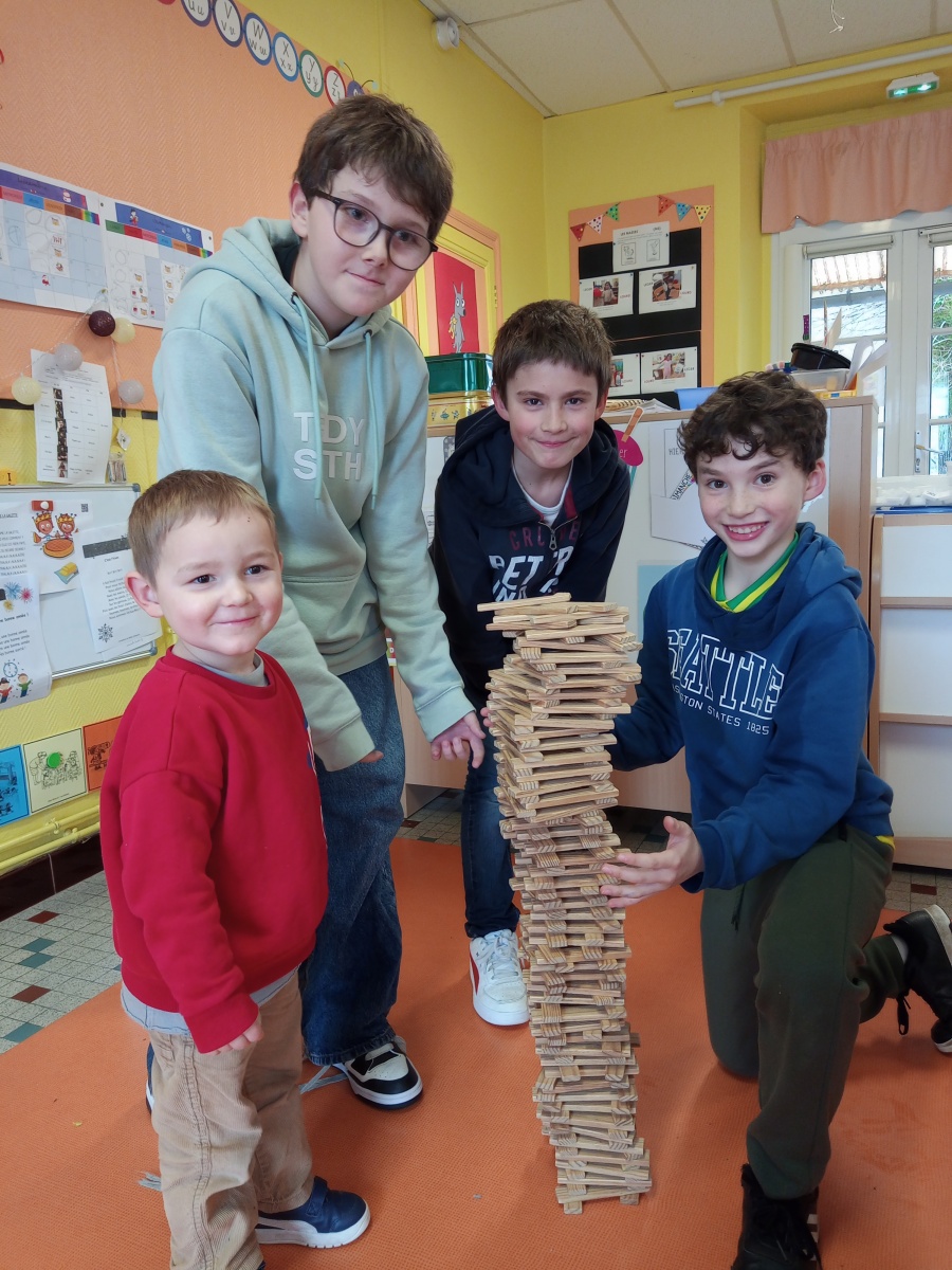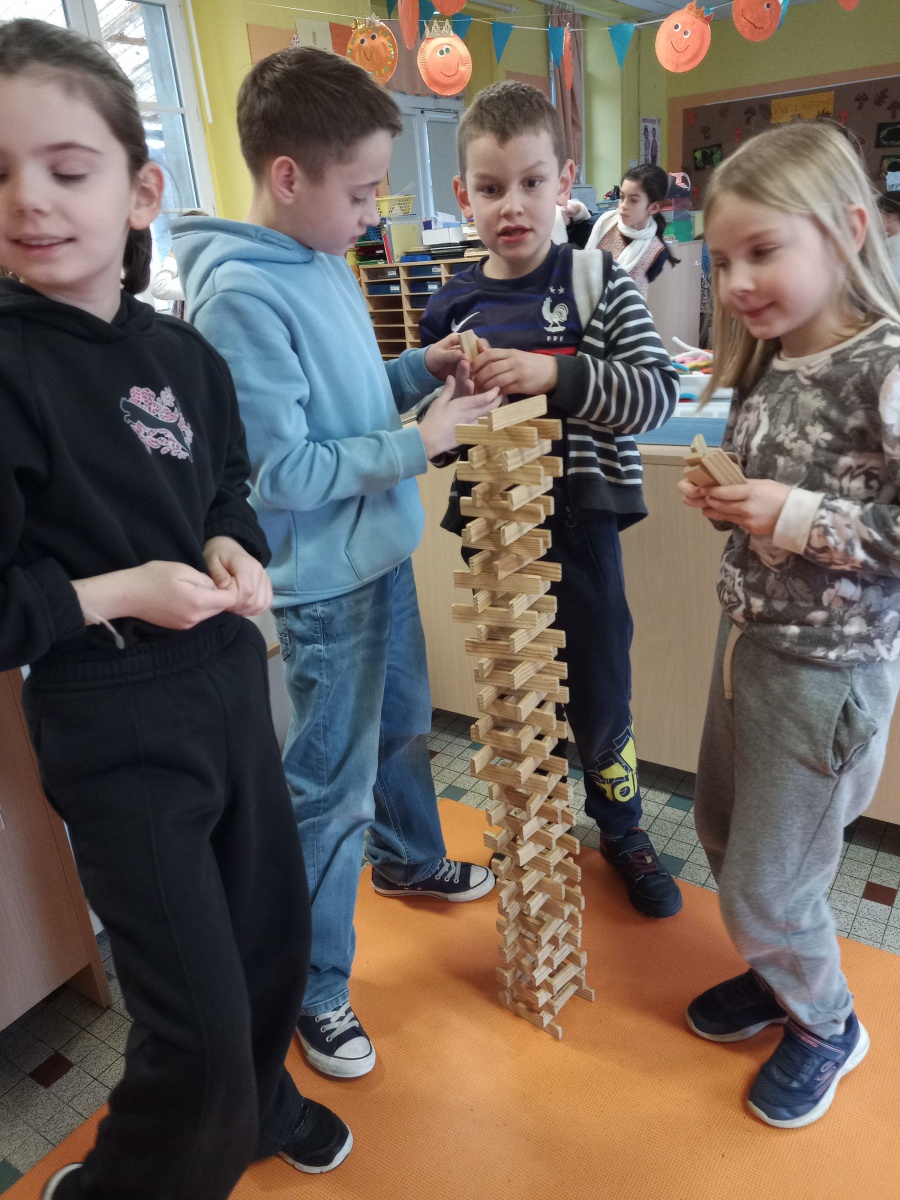 Organisés dans chaque classe, ces moments ont permis aux élèves de se mélanger et de coopérer, les grands accompagnant les petits. Plusieurs jeux étaient proposés : mémory, dominos, lotos, Premier Lynx, Mistigri, Croque-Carotte, Dingo Disc, défi tour de Kaplas…