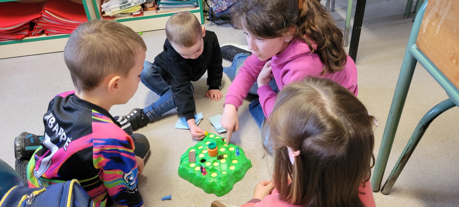 Lors de la dernière semaine avant les vacances, les élèves des classes de PS/MS (classe de Valérie F.), de CP/CE1 (classe d’Anaïs et de Marie-Laure) et de CM1 (classe de Sandrine) se sont retrouvés pour vivre des temps de jeux de société en ateliers multi-âges.