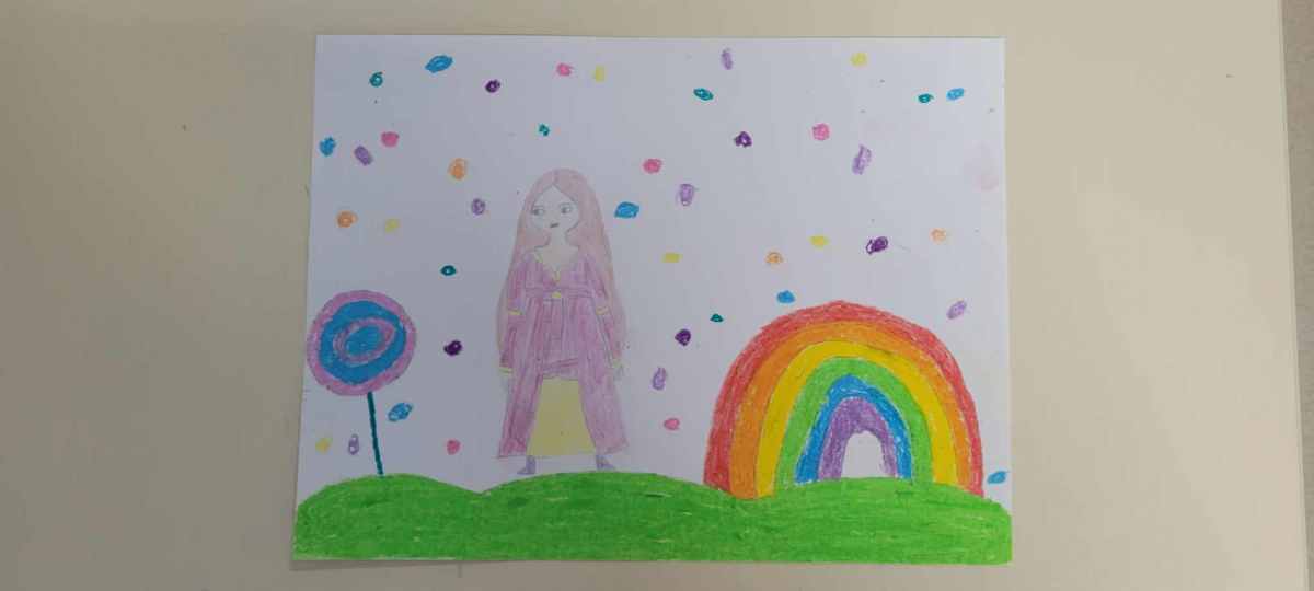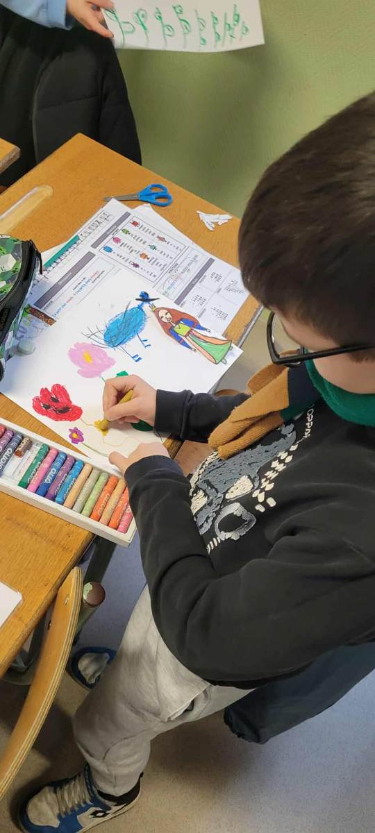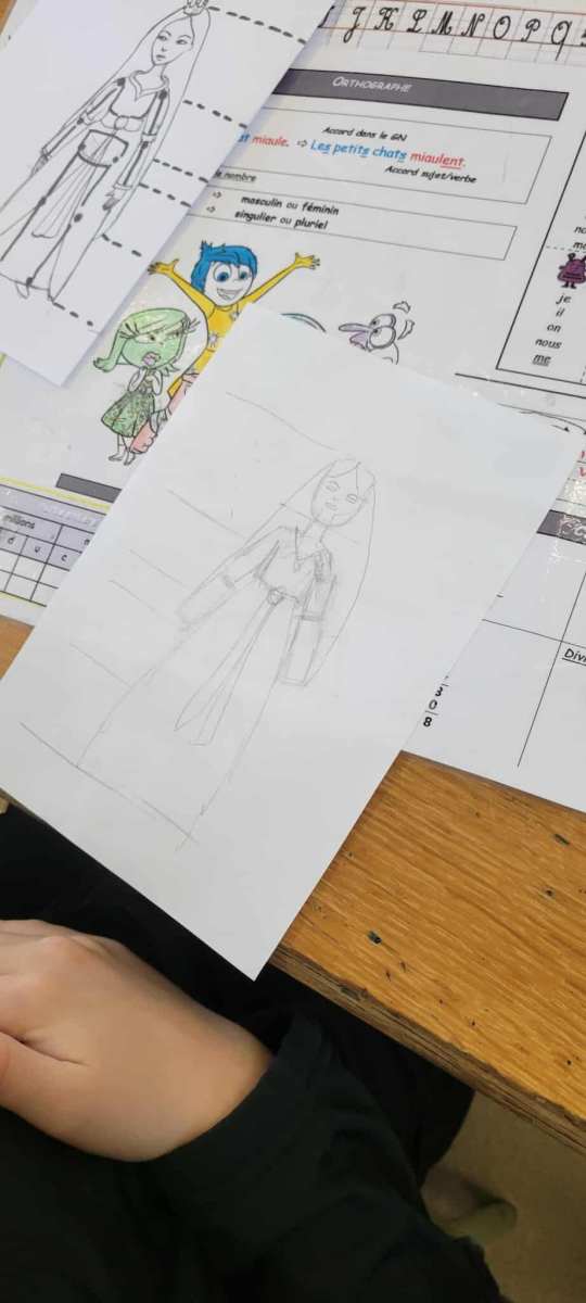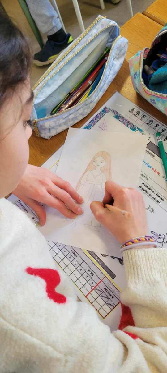 Ensuite, Katell nous a appris Ă dessiner deux personnages de « Pas autant que ça », un de ses albums que nous avions dĂ©couvert en classe avant sa venue. Elle nous a expliquĂ© sa technique et chacun a pu essayer, elle a aidĂ© certains d’entre nous. Puis, elle nous a proposĂ© d’utiliser les pastels pour crĂ©er notre jardin extraordinaire dans lequel insĂ©rer nos personnages.