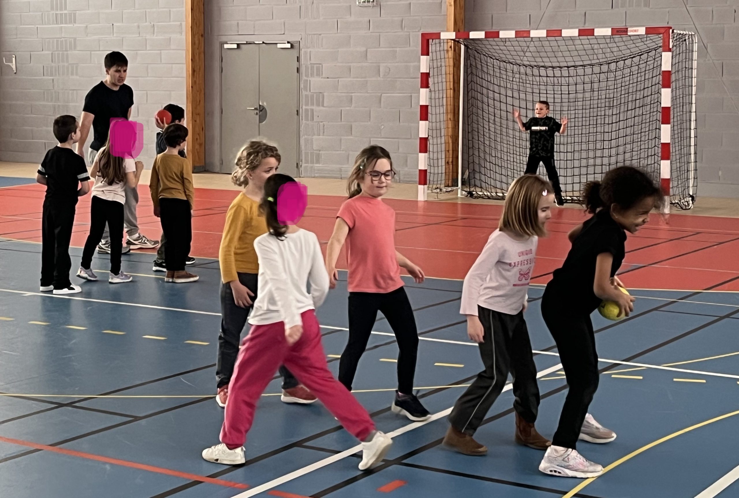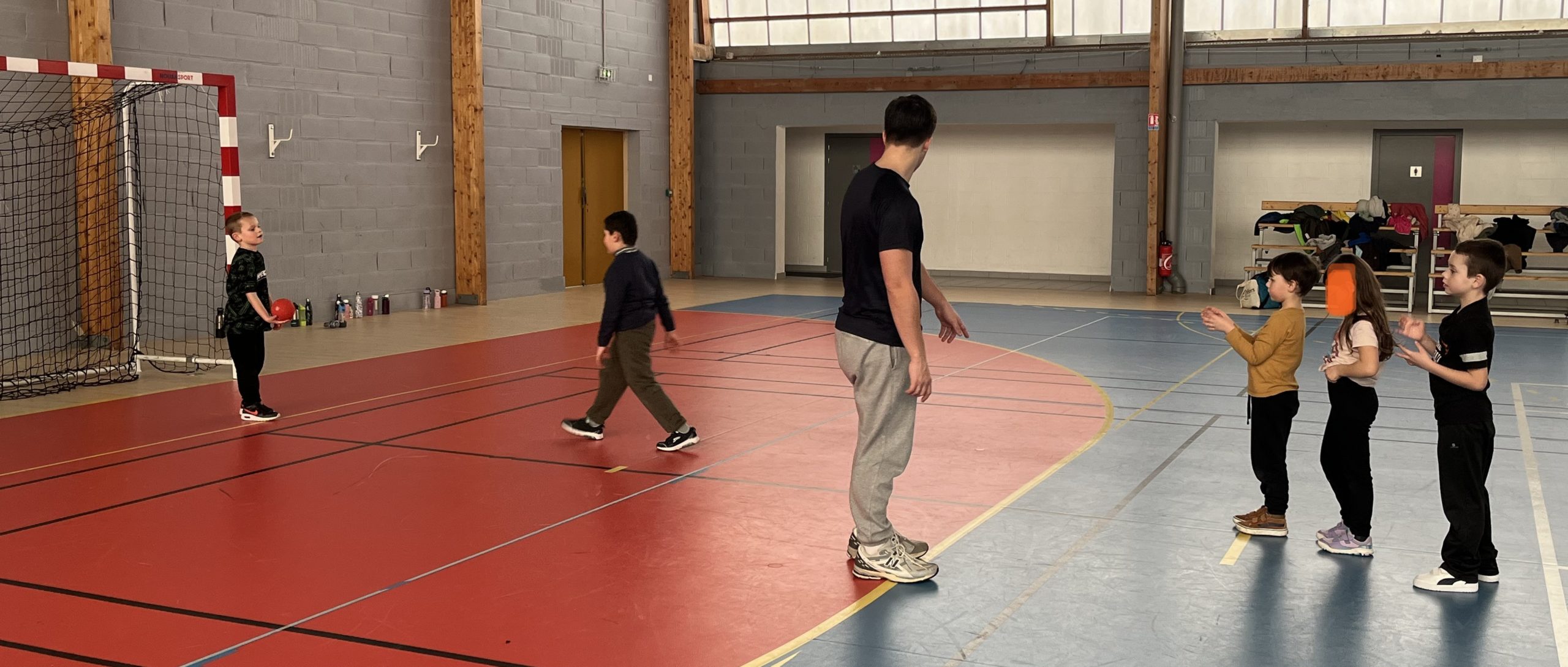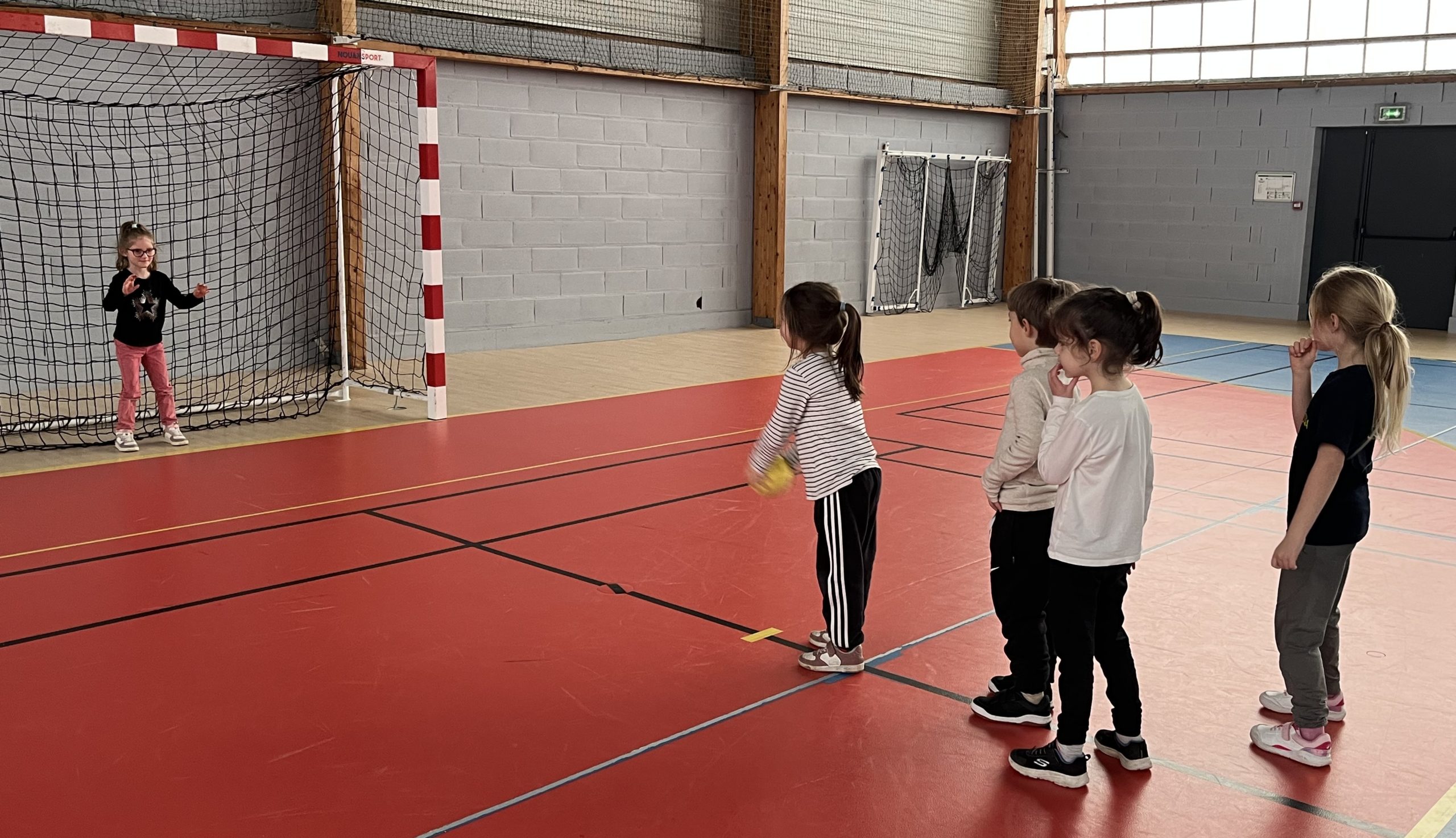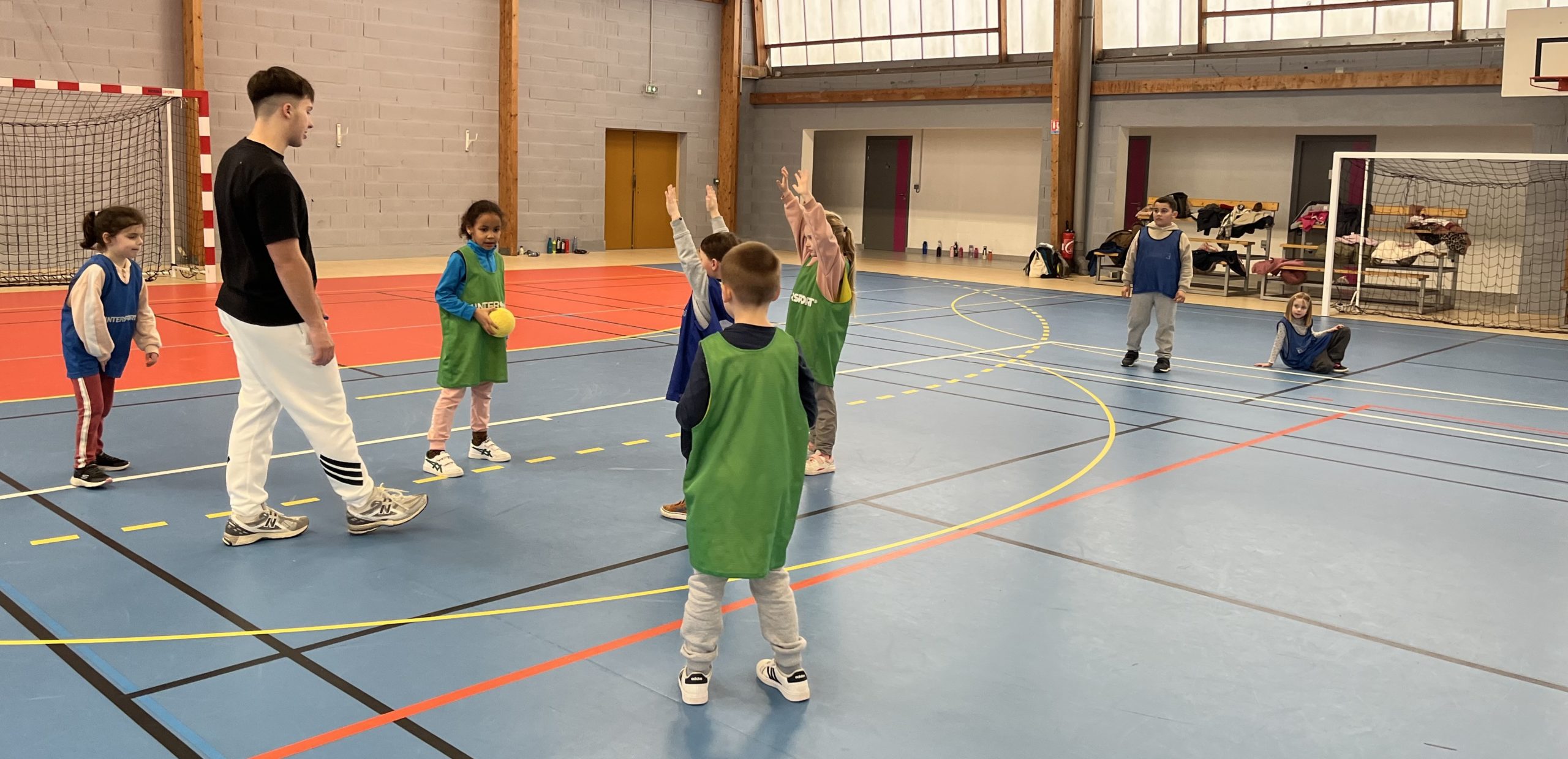 En janvier et fĂ©vrier, les enfants de la classe de CP ont eu la chance de s’initier au handball avec MatĂ©o.