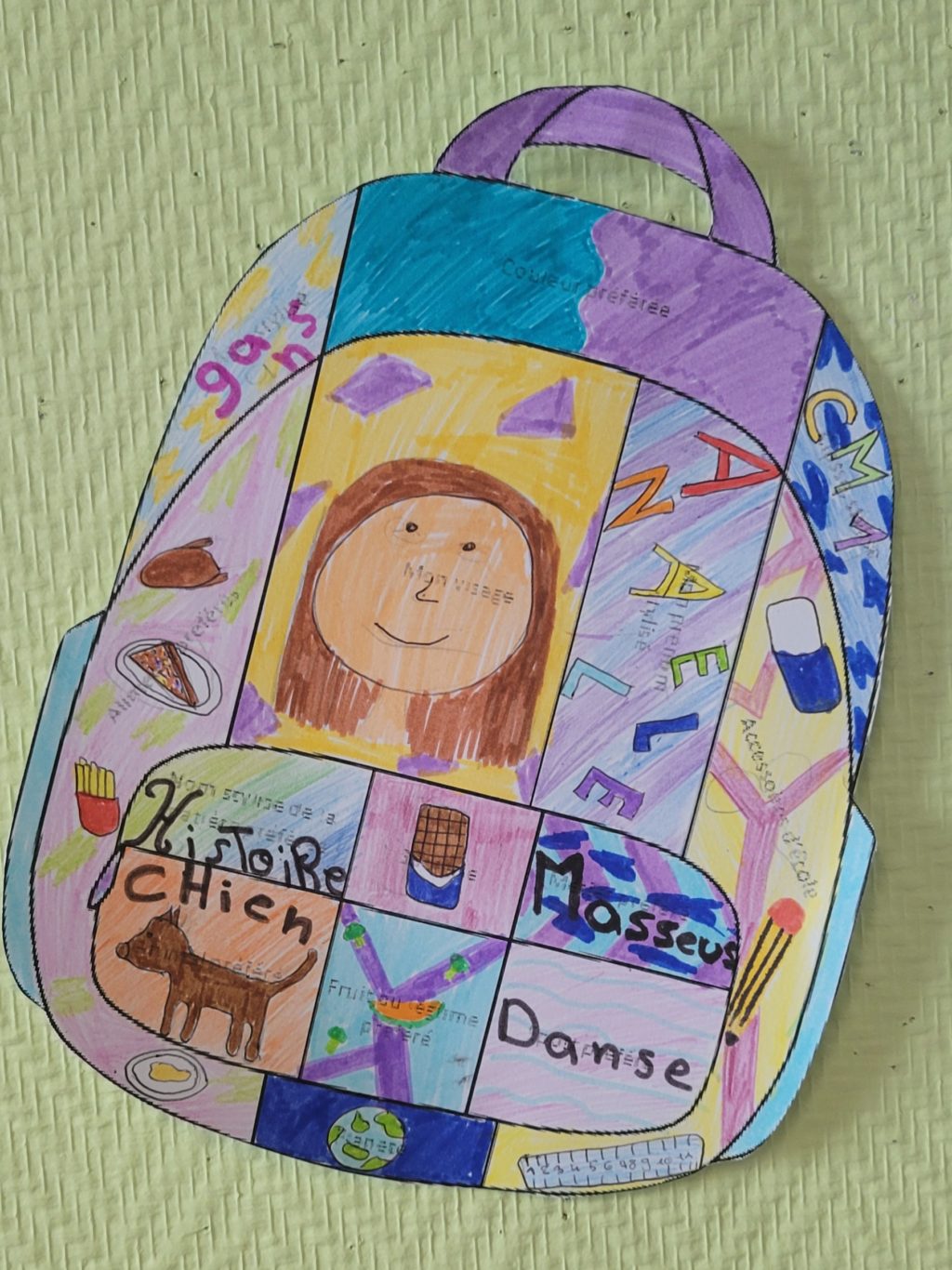 Voici la première activité réalisée en art par les CM1. Présente-toi à travers ce cartable : ton âge, ta couleur préférée, ta matière préférée, ton sport favori, le plat que tu adores, le métier que tu aimerais faire, ton animal etc.